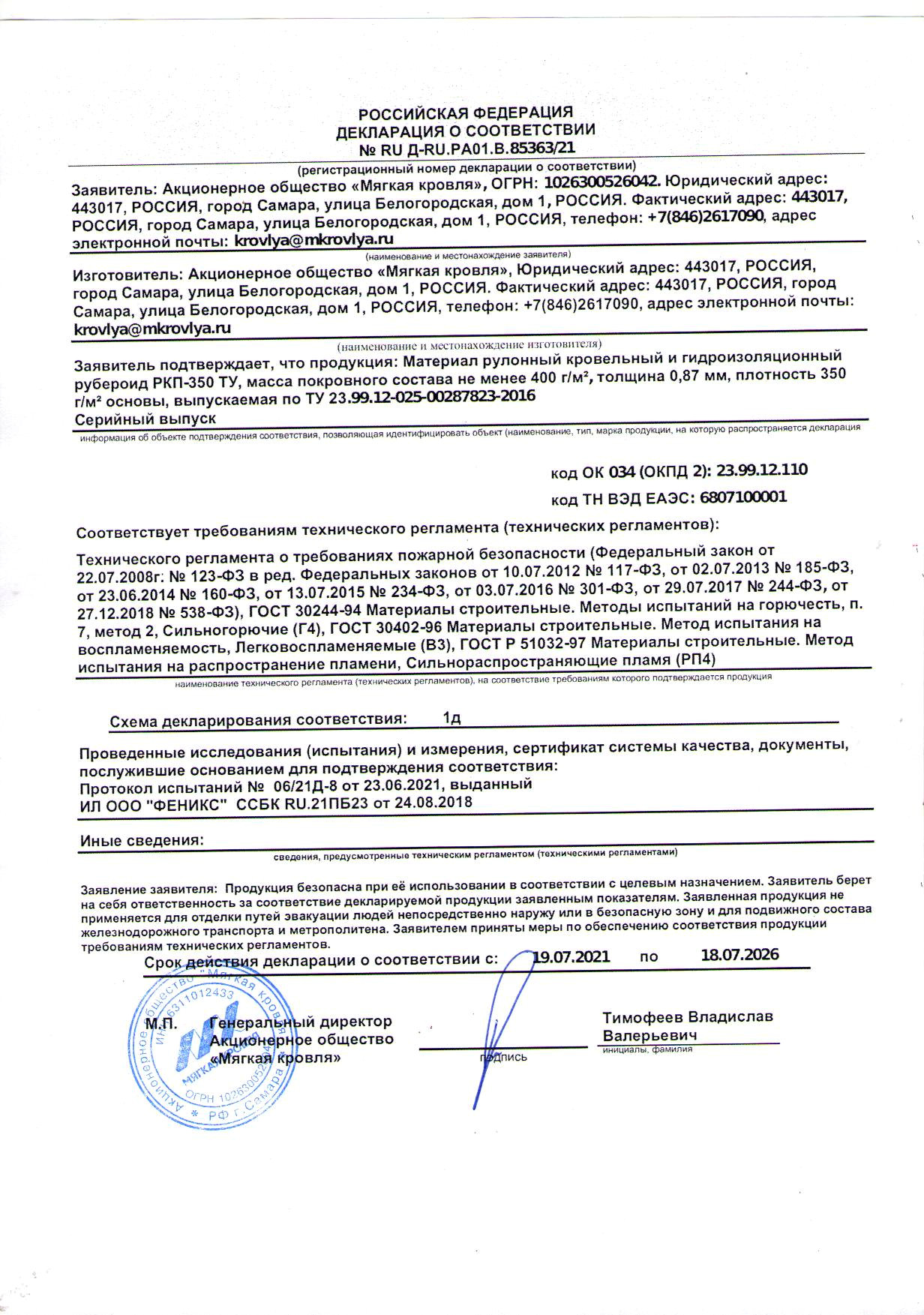 Рубероид РКП-350 ТУ. Декларация о соответствии